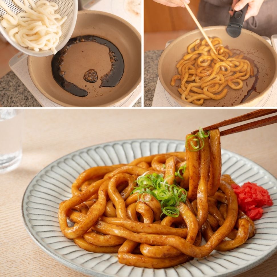 3.熱したたれに水気を切っておいたうどんを入れてからめるように焼いたら出来上がりです。