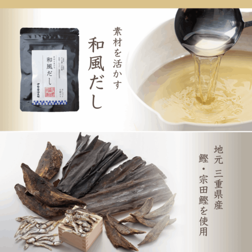 全国の料亭やこだわりの蕎麦屋やうどん屋が注目する、地元・三重県産の鰹や宗田鰹を使用した上質な「だし」に仕上げました。