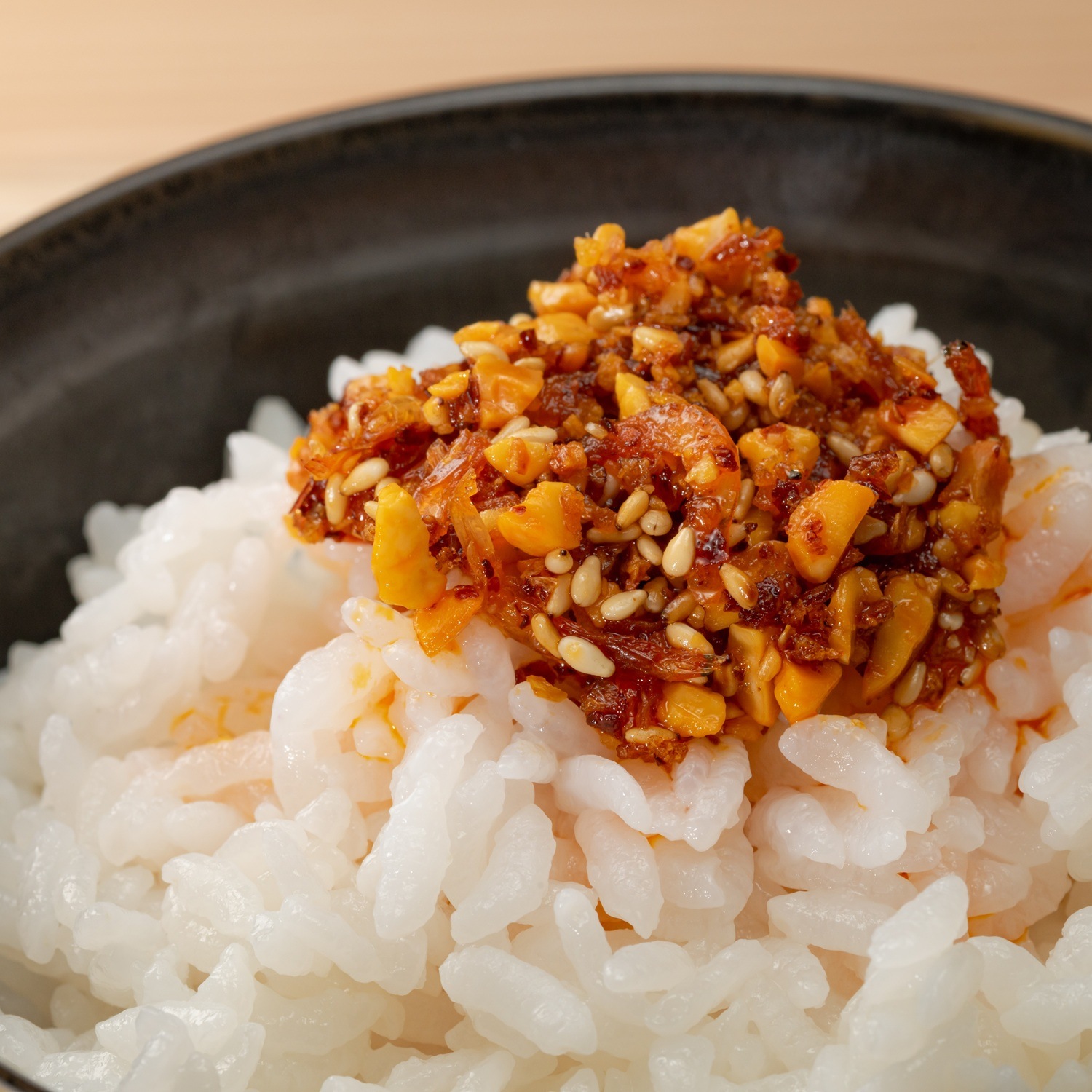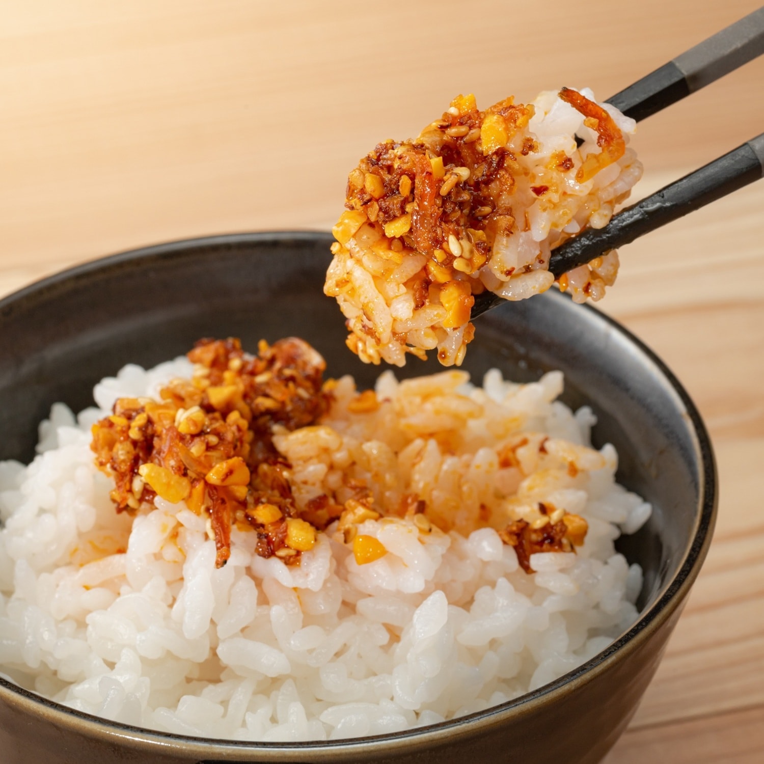 炊きたてのごはんにのせてお召し上がりください。ラー油と海老の香りが食欲をかきたて、箸を持つ手が止まりません。