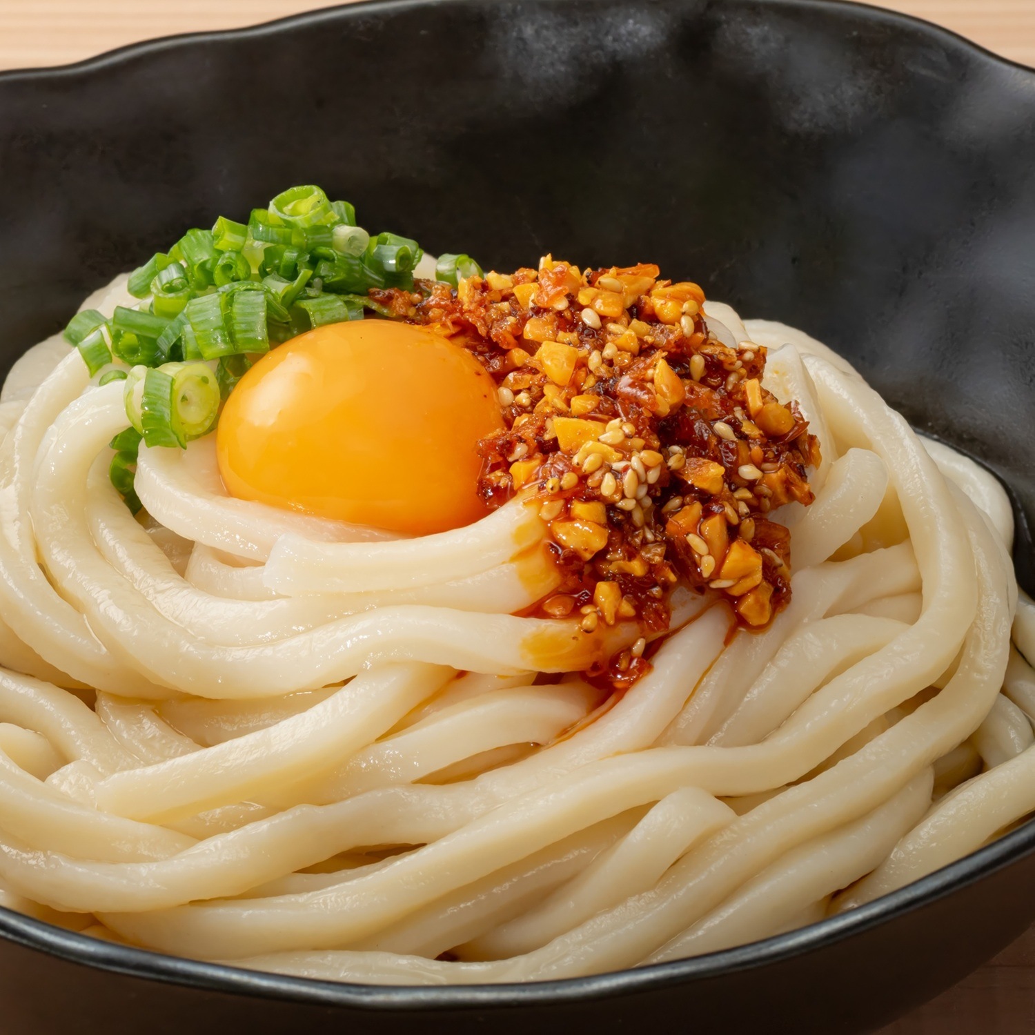シンプルなうどんにラー油と卵トッピングがとても合います。